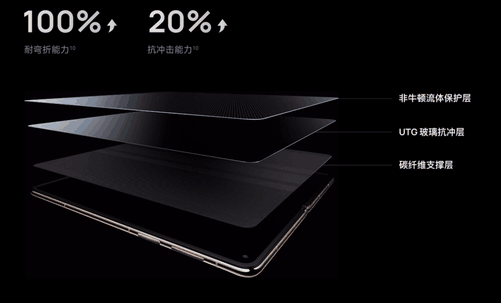 内屏方面,华为MateX7采用了业界首创的三重复合叠层结构设计,这是材料科学、结构工程与用户体验深度融合的杰作。通过非牛顿流体保护层、UTG玻璃抗冲层和碳纤维支撑层的精妙组合,成功攻克了折叠屏“易损、易折、易老化”的行业难题。