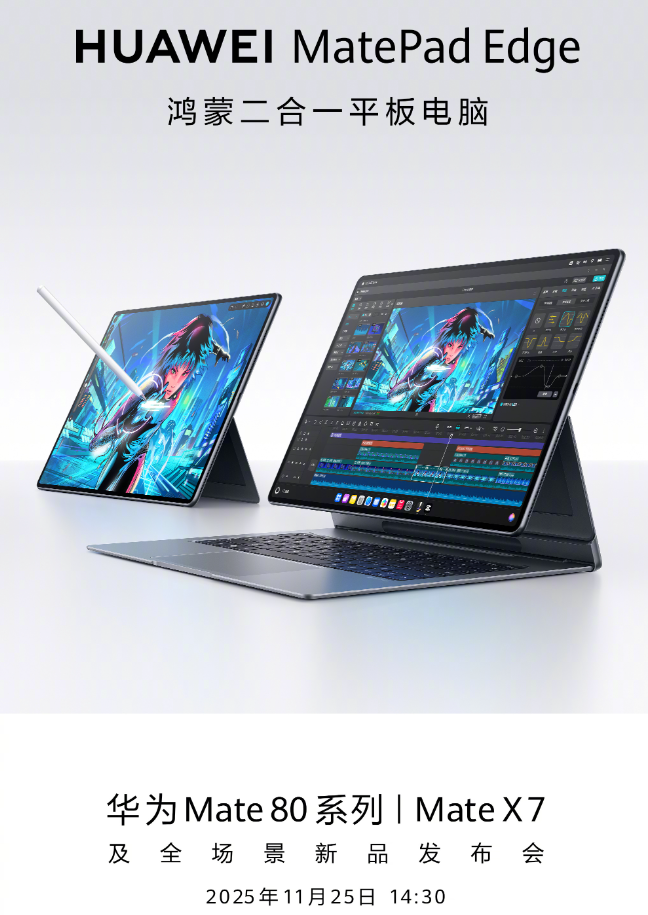 【CNMO科技消息】11月19日,华为正式宣布其全新超旗舰二合一设备——华为MatePad Edge将于11月25日14:30发布。官方将其定位为“巨幕平板今日股票配资平台,更是性能电脑”,强调其在大屏体验与生产力性能上的双重突破。